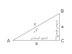 - sin ، جا : جيب الزاوية A = طول الضلع المقابل / الوتر(h/a)