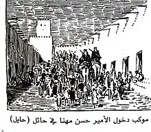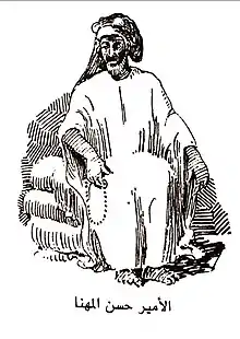 ![]() رسم لأمير بريدة حسن بن مهنا بريشة المستشرق والرحالة الألماني يوليوس أويتنغ عام 1883 في مدينة حائل[1] | |||||||
