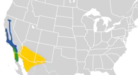 ![]() الأزرق: مُفرخ، الأخضر: مقيم دائم، الأصفر: زائرٌ شتويّ | |