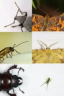 ![]() باتجاه عقارب الساعة: الذبابة الراقصة، سوسة الفاكهة طويلة الخطم، جدجد الخلد، الزنبور الألماني، عثة الصمغ الإمبراطورية، والبقة السفّاكة. | |