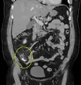 ![]() حصاة برازية مشاراً إليها بالسهم والتي تسببت بالتهاب في الزائدة الدودية. حصاة برازية مشاراً إليها بالسهم والتي تسببت بالتهاب في الزائدة الدودية. | |