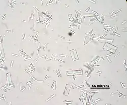 تظهر بلورات أكسالات الكالسيوم في البول مجهرياً على أنها "مغلفات". كما أنها قد تشكل "بلورات قضيب الكُرَتَين dumbbells".[58]