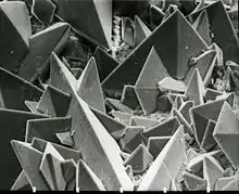 تأخذ بللورات حصوات الستروفيت شكل "غطاء التابوت" تحت المجهر.[58]