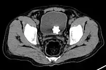 ![]() ويمكن مُلاحظة حصاة على شكل نجمة في المثانة البولية بالأشعة قريبة من الحوض. ويمكن مُلاحظة حصاة على شكل نجمة في المثانة البولية بالأشعة قريبة من الحوض. | |
