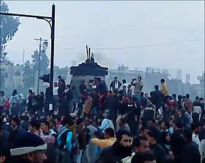 ![]() بقايا تمثال حافظ الأسد في مدينة درعا بعد تحطيم المُتظاهرين وإحراقهم له في "جمعة العزة" بتاريخ 25 مارس. | |||||||