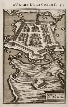 ![]() نقش لقلعة "سانتا مورا" من "فن المعركة" لـ "مانيسون ماليت". | |||||||