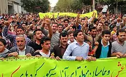 واندلعت احتجاجات في العديد من المدن الكردية في غرب إيران، فضلا عن مدن أخرى في مختلف أنحاء البلاد مثل تبريز ومشهد وطهران نفسها أمام السفارة التركية للتعبير عن دعمها كوباني. كما حضر بعض الاحتجاجات نشطاء حقوق الإنسان والمعارضون. كما أضرب الموسيقيون الأكراد الإيرانيون شهرام ناظري وصديق طريف عن الطعام للفت الانتباه إلى محنة الأكراد في كوباني. دعت إحدى افتتاحيات موقع خبر أونلاين الإيراني المحافظ اللواء قاسم سليماني إلى المساعدة في الدفاع عن كوباني. وبصفته قائد فيلق القدس، كان سليماني منخرطا بشكل كبير في تقديم المشورة للقوات العراقية والمليشيات منذ أن سيطر تنظيم الدولة الإسلامية على أجزاء كبيرة من غرب العراق هذا الصيف. وأصبحت صورته إلى جانب القوات العراقية والكردية العراقية في مختلف المدن العراقية شائعة حيث لم تخفي إيران وجودها هناك. ونقلت المقالة عن تقارير تفيد بأن سليماني وإيران اشتركا في تحرير بلدة آمرلي العراقية وقدما الأسلحة للقوات الكردية في العراق لمحاربة تنظيم الدولة الإسلامية. وتلت ان "ثقل المقاومة في المنطقة" كان على عاتقه.[141] وأشادت شيرين عبادي الحائزة على جائزة نوبل للسلام بنساء كوباني قائلة "إن نساء كوباني رمز حقيقي للمرأة الشجاعة..."[142]