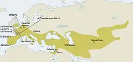- يوجد في سيبيريا العديد من المواقع ذات الأدوات على الطراز المويستيري، على سبيل المثال كهف دينيسوفا.[17]