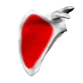 ![]() السطح الداخلي لعظم الكتف، حفرة تحت الكتف ملونة باللون الأحمر. | |