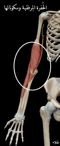 - العَضَلَةُ العَضُدِيَّةُ الكُعْبُرِيَّة (Brachioradial Muscle) [3] : حيث تُشكل الحد الجانبي -أبعد عن الخط المنصف للجسم- .