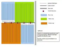 يهدف التحكم المياه الجوفية في صرف الأراضي الزراعية إلى إنشاء عمق محدد للمياه الجوفية (الشكل 1) التي لا تتدخل سلبا مع العمليات الزراعية الضرورية والمحاصيل الزراعية (الشكل 2، صنع بطريقة انحدار المجزأة).