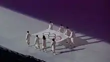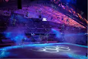 تنزل 5 ثلجات كبيرة إلى الملعب والتي توسعت ولتشكل الحلقات الأولمبية.ومع ذلك، وجد خطأ فني في الدائرة الخامسة ولم تتوسع، ولم تخرج الألعاب النارية من الحلقات. وصرح قسطنطين ارنست عن الخلل قائلا "لا يوجد شخص طبيعي سوف ينشغل بالحلقة الأولمبية التي لم تتوسع في هذا الحفل الذي استمر لأكثر من ساعتين ونصف.[11]