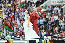 - بعدها احتل مغني البوب الإنجليزي روبي ويليامز الصدارة بعدما عدة أغاني قديمة اشتهرت في تسعينات القرن الماضي.[6] فأدى أغنية "دعني أمتعك" (بالإنجليزية: Let Me Entertain You)، قبل أن يتم عزف السوبرانو الروسي لعايدة جارفولنا. غنى ويليامز كذلك قسماً من أغنية "فيل" (بالإنجليزية: Feel)، قبل أن يقوم هو وغاريفولينا بعمل دويتو من لأغنية لأٌغنية “الملائكة” (بالإنجليزية: Angels)، حيث ظهر الفنانون وهو مرتدين أعلام جميع الفرق الـ 32 ويحملون لافتة تحمل اسم كل دولة.[7]