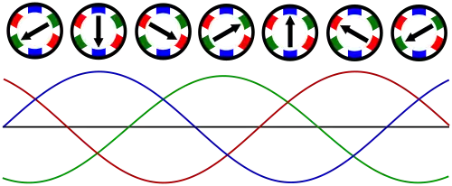 حقل مغناطيسي دوار ثلاثي الأوجه، توضّحه الأسهم السوداء الدوّارة.