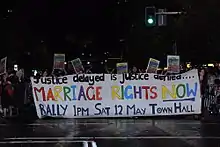 |CitationClass=تم تجاهله (مساعدة) - "Anger over rally to ridicule gay marriage". The Sydney Morning Herald. Fairfax Media. 16 August 2011. مؤرشف من الأصل في 25 نوفمبر 2018. اطلع عليه بتاريخ 06 نوفمبر 2016. الوسيط