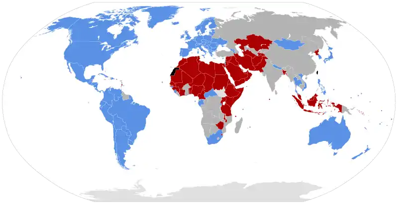 | | لا هذا و لا ذاك | الدول التي فيما يتعلق بالأمم المتحدة لم تعرب أي دعم رسمي ولا معارضة لحقوق المثليين (44 عضوا). |
