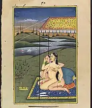 امرأتان تستخدمان الجزر كقضبان اصطناعية، لوحة بألوان الغواش من القرن العشرين.