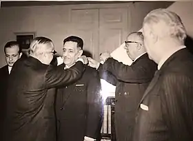 ![]() الرئيس اللبناني شارل الحلو يقلد حقي المفتي القائم بالأعمال العراقي في لبنان وسام الأرز من الدرجة الثانية عام 1968 | |