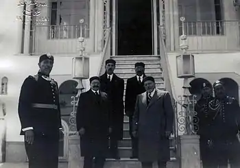 في درج قصر المرسى سنة 1942: الوزير الأكبر الهادي الأخوة (على يمين الصف الأول) ووزير العدل عبد الجليل الزاوش (على يمين الصف الثاني) ووزير القلم أحمد بالرايس.