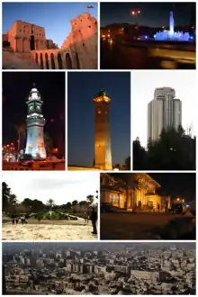 ![]() معالم مدينة حلب ساحة السبع بحرات •قلعة حلب مبنى القصر البلدي •مئذنة المسجد الأموي •ساعة باب الفرج محطة بغداد (محطة القطار) •الحديقة العامة بيوت في حلب القديمة من القلعة | |