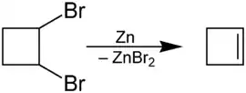 يحضر مركب حلقي البوتين بحدوث تفاعل حذف لمركب 2،1-ثنائي بروم حلقي البوتان بواسطة مسحوق من الزنك:[3]