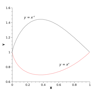 التمثيل البياني للدالتين y = xx وy = x−x على الفترة (0،1).