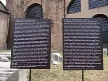 يصف لنا نقش اهداء مبنى الحمّامات ظروف بناءها. كُتِبَ الإهداء بين عام 305 و306، وهي معروضة اليوم في متحف روما الوطني.[3] نص الإهداء: