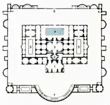 مبنى الحمّامات متماثل من جانبيه، بحيث أن كل من يدخل البناية، من الجهة الشمالية أو الجنوبية، يدخل أوّلًا للأتريا atria وللأبوديتيريام apodyteriam وهم غرف لتغيير الملابس وحفظها حتى انتهاء عملية الاستحمام. من هناك، يستطيع الزائر أن يدخل مباشرة للناتاتيو natatio وهي بركة خارجية، أو للبلسترا palaestrae (صالة رياضة خارجية). لتحديد الأماكن المخصّصة للفعاليات الرياضيّة، وُضِعَت أعمدة غرانيت كبيرة.[4]