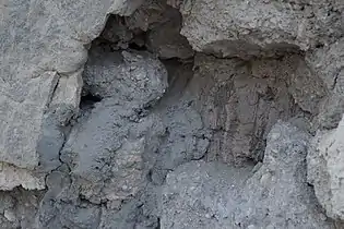 صدع في أحد جدران الحمام يُبيّن جزءاً من البنية الداخلية لحمام أبو لوزة وتظهر المواد المتكوّنة منها وهي أحجار الجصّ مع جذوع النخل.