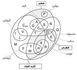 تقسم الأحماض الألفا-أمينية العشرون الموجودة في البروتينات، والمشفرة في الشفرة الوراثية، إلى مجموعات حسب عدد من الخصائص الفيزيائية، الكيميائية والأحيائية :