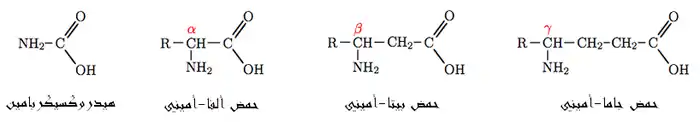 يعتبر هيدروكسي كرب أميد (بالإنجليزية: Hydroxycarbamide) الحمض الأميني الأبسط من حيث التركيب فهو متكون من جذر أميني متصل مباشرة بكربون جذر الهيدروكسيل COOH- . وهذا المركب غير أحيائي. أما في بقية الأحماض الأمينية فتدخل ذرة أو أكثر من الكربون بين هذين الجذرين. ويحدد موقع الأمين في السلسلة الكربونية الفئة ( أحمر : ألفا، بيتا، جاما) التي ينتمي إليها الحمض الأميني كما يلي: