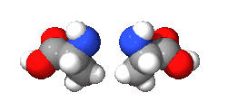 و في المثال الموجود على النموذج المقابل، نجد الـ -ألانين وكأنه صورة عبر المرآة لالـ -ألانين، وهما مركبان لا يمكن مطابقتهما non-superimposable، تماما كما لا يمكن مطابقة كف اليد اليمنى مع ظهر اليد اليسرى صورة. ولسبب لا يزال محيرا، فان غالبية الأحماض الألفا-أمينية المكونة للبروتينات هي من النظيرة وليست . ولكن يمكن أن نجد بعض الـ -أحماض أمينية في أنواع مـن الصدفيات [4] مثل عائلة الكونيدات Conidae، وفي الغشاء البيبتدوسكري Peptidoglycan لبعض البكتيريا.[5]