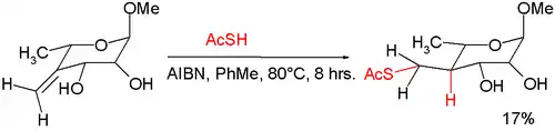 يستخدم حمض الثيوأسيتيك في الاصطناع العضوي لإضافة مجموعة الثيول إلى الجزيئات؛[5] كما هو الحال في المثال التالي:[6]