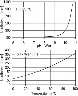 وبارتفاع درجة الحرارة وارتفاع الباهاء يرتفع بالتالي ذوبانه في الماء . فعند درجة حرارة 75 °C ; تبلغ نسبته 330 جزء في مليون جزء من الماء .[3][4]