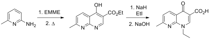|CitationClass=تم تجاهله (مساعدة) - Lesher GY, Froelich EJ, Gruett MD, Bailey JH, Brundage RP (Sep 1962). "1,8-Naphthyridine derivatives. A new class of chemotherapeutic agents". Journal of Medicinal and Pharmaceutical Chemistry. 91. doi:10.1021/jm01240a021. PMID 14056431. الوسيط