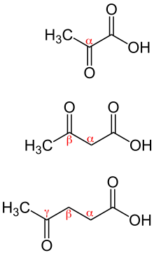 توسم أحماض كيتو بالرمز ألفا α عندما تكون مجموعتي الكربونيل (في الكيتون والحمض الكربوكسيلي) متجاورتين. لألفا أحماض الكيتو أهمية كبيرة في الكيمياء الحيوية وعلم الأحياء وذلك في دورة حمض الستريك وتحلل السكر على سبيل المثال.[2]