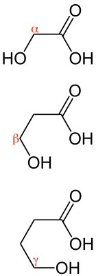- حمض غاما-هيدروكسي (أو حمض جاما-هيدروكسي): وترتبط فيه مجموعة الهيدروكسيل بأي كربون في السلسلة الكربونية بخلاف الموقعين ألفا وبيتا.