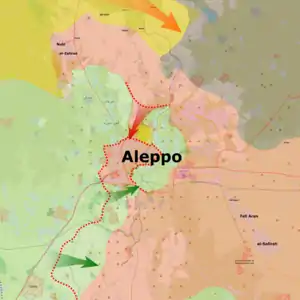 ![]() خريطة شمال سوريا خلال الهجوم، مع المنطقة الموضحة ضمن خريطة مدينة حلب التي تحمل علامة الصندوق. | |||||||