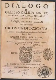 | (بالإيطالية: Dialogo Doue ne i congreſſi di quattro giornate ſi discorre ſopra i due massimi sistemi del mondo Tolemaico, e Copernicano) | |