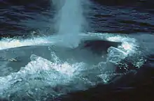 زعنفة الحوت الأزرق الظهرية صغيرة،[26] إذ يتراوح ارتفاعها ما بين 8 و70 سنتمتراً (3,1-28 إنشاً)، وارتفاعها في أغلب الحالات ما بين 20 و40 سنتمتراً (7,9-16 إنشاً)، أي أن متوسط ارتفاعها يبلغ حوالي 28 سنتمتراً (11 إنشاً)،[27] وتكون هذه الزعنفة مرئية لفترة وجيزة فقط أثناء الغوص المتتالي، وهي تقع على امتداد ثلاثة أرباع الجسم طولياً، وتختلف في شكلها من فرد إلى آخر، إذ تمتلك بعض الحيتان قطعة صغيرة يصعب الإحساس بها أو لمسها، وأما بعضها الآخر فيمتلك زعنفة ظهرية بارزة منجلية الشكل. وعندما يخرج الحوت الأزرق إلى سطح الماء ليتنفس، فإنه يرفع كتفيه وفتحة نفثه خارج الماء إلى حد أكبر من غيره من الحيتان الكبيرة، مثل الحيتان الزعنفية وحيتان ساي، ويمكن أن يستخدم المراقبون هذه الصفة للتمييز بين الأنواع المختلفة في البحر، كما أن بعض الحيتان الزرقاء في شمال المحيط الأطلسي وشمال المحيط الهادئ ترفع أذيالها عند الغوص. عندما يتنفس الحوت الأزرق فإنه يقوم بنفث عمود من الماء بشكل رأسي مثير للدهشة يصل إلى ارتفاع 12 متراً (39 قدماً)، وعادةً 9 أمتار (30 قدماً)، وتبلغ سعة رئة الحوت 5,000 لتر، وهو يمتلك فتحتي نفث متماثلتين يحميهما جزء ضخم.[26]