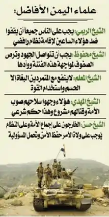 |CitationClass=تم تجاهله (مساعدة) - Barak A. Salmoni, Bryce Loidolt, Madeleine Wells (2010). Regime and Periphery in Northern Yemen: The Huthi Phenomenon. Rand Corporation. صفحة 197. ISBN 0833049747. الوسيط