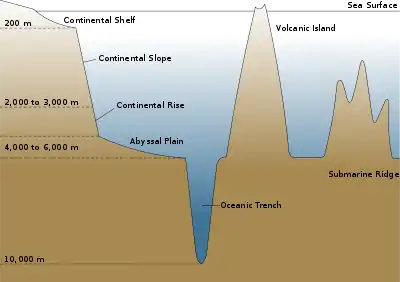 تعتبر الأرض هي الكوكب الوحيد في المجموعة الشمسية المعروف بأن لديه مرتفعات أرضية ثنائية النمط تظهر كأنواع مختلفة من القشرة متمثلة في القشرة المحيطية والقشرة القارية.[4] فالمحيطات تغطي 70% من سطح الأرض. ولأن المحيطات تقع تحت مستوى القارات، فهي تعتبر أحواضا رواسبية تجمع الرواسب التي نزعها التآكل من القارات والتي تعرف باسم الرواسب الفتاتية وكذلك باسم رواسب الترسيب. وتعتبر الأحواض المحيطية أيضًا مستودعات للهياكل العظمية الخاصة بالكائنات التي تفرز الكربونات وثاني أكسيد السليكونمثل الشعاب المرجانية, والدياتومات, والشعاعيات والمنخريات.