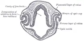 ![]() مقطع مستعرض من رأس جنين صوص عمره 48 ساعة. (الحويصلة البصرية معنونة في الركن الأسفل الأيمن). | |