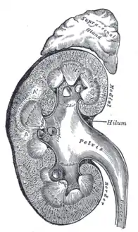 - شكل تشريحي: 40:03-07 على موقع مركز سوني دونستات الطبي (تشريح بشري عبر الإنترنت).—"Section of the kidney, anterior view."