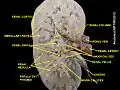 9. محفظة الكلية 10. محفظة الكلية السفلية 11. محفظة الكلية العلوية 12. أوردة بين فصوص الكلية 13. الكليون 14. جيب كلوي 15. كأس الكلية الرئيسي 16. حليمة كلوية 17. عمود كلوي |