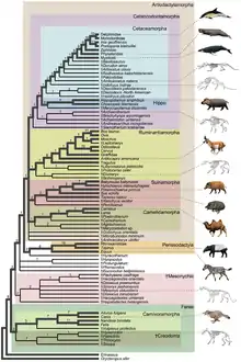 Cladogram showing Whippomorpha within Artiodactylamorpha. Whippomorpha consists of the clades labeled Hippo and Cetaceamorpha.