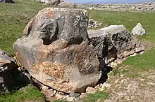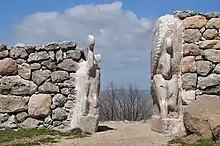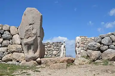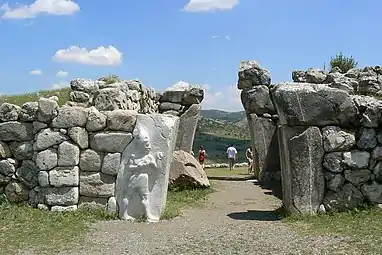 - بوابة السفنكس وضعت تحت حراسة أربعة سفنكسات بالأصل ، بقي منها سفنكسان على جانب المطل على المدينة، وسفنكس ثالثة تالفة على الجهة الخارجية من البوابة. في حالة تمثال السفتكس ، تم نحت الكتل الحجرية على المقدمة وكذلك على الظهر كتماثيل مجسمة بالإضافة إلى نحت نافر على سطوحها الجانبية. جُلب اثنين من السفنكس إلى برلين بعد اكتشافها في عام 1907م للترميم . وأعيد أحد هذه التمائيل إلى تركيا في عام 1924 م ، والآخر أعيد فقط في عام 2011 ( انظر أدناه ).