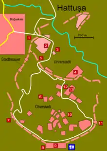 1 الجزء المعاد بناؤه من سور المدينة في المدينة السفلى 2 مجمع المعبد في المدينة السفلى مع المعبد الكبير ("المعبد 1") 3 منزل على منحدر (مبنى إداري) 4 ظهر صخري Büyükkale (صخور مع القلعة الملكية) 5 كيسيكايا Kesikkaya (الصخور المشقوقة) 6 ساريكال Sarıkale (صخور كبيرة) 7 بوابة أسود 8 ساتر يركابي Yerkapı9 بوابة سفنكس10 حي معبد البلدة العليا 11 بوابة الملك 12 مدخل إلى القلعة الجنوبية 13 القلعة الجنوبية مع غرفة هيروغليفية