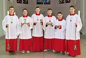 كانت خدمة المذبح سابقًا تقتصر على الرجال والفتيان، ولكن القانون 230 من مدونة القانون الكنسي الصادر في عام 1983 سمح للأساقفة المحليين السماح للفتيات والنساء للقيام بخدمة المذبح. في الولايات المتحدة، في أبرشية لينكولن في نبراسكا لم يمنح إذن بذلك.[1] المجموعات الكاثوليكية التقليديين لا تسمح للنساء في خدمة الهيكل.