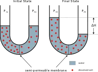 ويظل الماء ينتقل عبر الغشاء من عامود الماء النقي إلى عامود المحلول الملحي حتي يصل إلى نهاية عظمى عند ارتفاع ثابت. ويسمى فرق ارتفاع عمودي الماء والمحلول بالضغط الإسموزي أو ضغط التناضح.